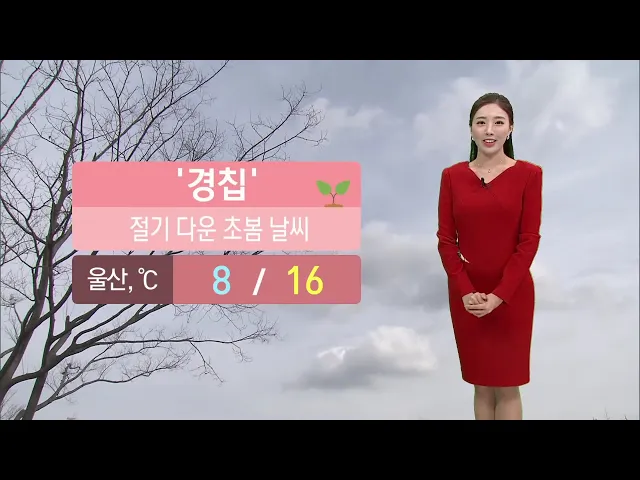 [절기 '경칩' 한낮 최고 16도.. 큰 일교차]1) 오늘은 개구리가 겨울잠에서 깨어난다는 절기 경칩인데요. 절기답게 초봄 날씨를 보이겠습니다. 오늘 울산의 낮 기온이 16도까지 크게 오르면서 평년보다 5도가량 높아 포근하겠는데요. 큰 일교차에는 유의해 주셔야겠습니다. 2) 주말 날씨 살펴보시면 내일은 낮 기온 오늘보다...
