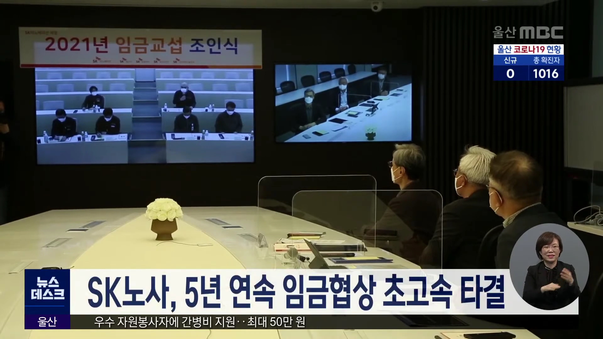 SK이노베이션 노사가 올해 임금교섭을 일주일 만에 타결하고 오늘(3/3) 서울과 울산을 연결해 화상으로 임금교섭 조인식을 가졌습니다. SK 노사는 지난 2017년 전년도 소비자물가지수에 연동해 임금교섭을 진행하기로 합의했고 올해도 이에 근거해 기본급의 0.5%를 인상하기로 했습니다. SK는 지난해 수조원대 적자를 내면...