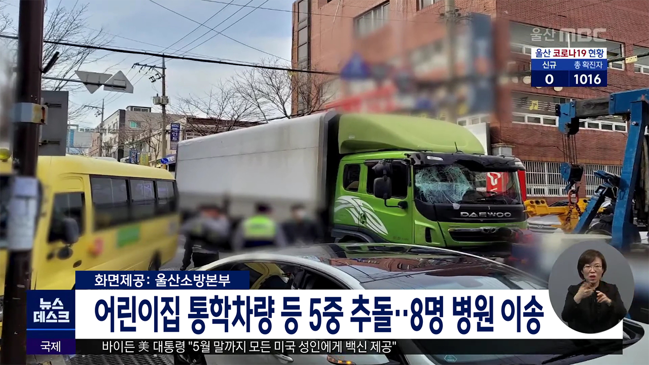 오늘(3/3) 오후 2시 44분쯤 동구 일산동의 한 도로에서 승용차와 어린이집 통학차량, 트럭 등이 5중 추돌했습니다. 이 사고로 어린이집 통학차량에 타고 있던 원생 4명을 포함해 모두 8명이 경상을 입고 병원으로 옮겨졌습니다. 경찰은 브레이크가 파열돼 정차해있던 어린이집 통학차량을 추돌했다는 트럭 운전자의 진술을 ...