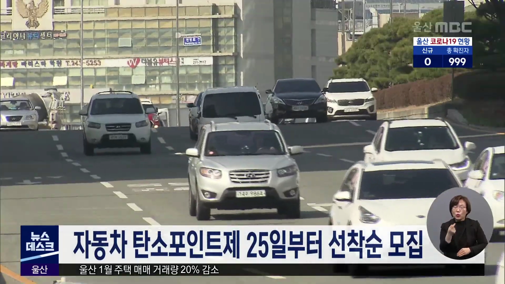 자동차 주행거리 단축 실적을 평가해 혜택을 제공하는 '자동차 탄소포인트제'가 시행됩니다. 울산시는 오는 25일부터 자동차 탄소포인트제 참여 차량 296대를 선착순으로 모집합니다. 지난해의 경우 차량 230대가 탄소포인트제에 참여해 이중 155대가 1천190만 원의 혜택을 받았습니다. //