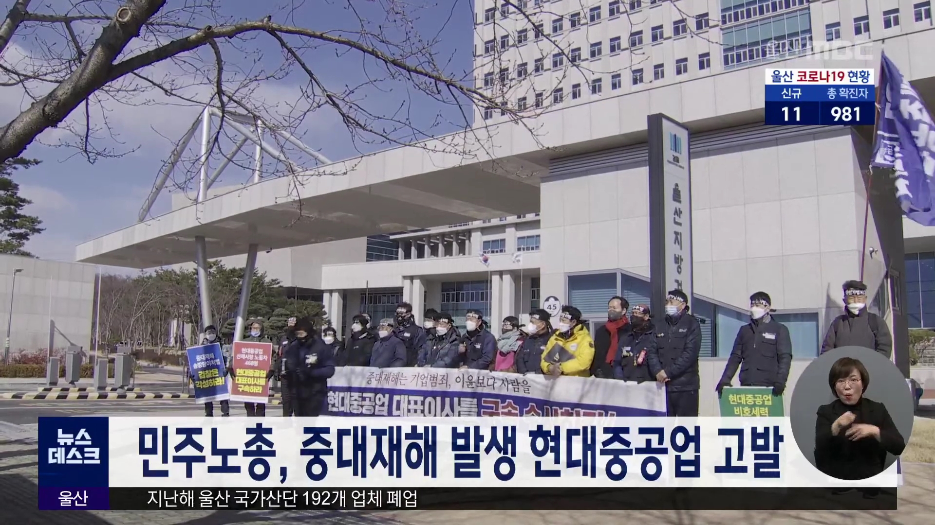 민주노총 울산본부는 최근 발생한 중대 재해 사고와 관련해 현대중공업 대표이사 등 7명을 산업안전보건법 위반 혐의로 울산지검에 고발했습니다. 민주노총은 "재해 당시 철판 추락이나 탈락을 방지할 안전장치가 설치돼 있지 않았고, 노동자 안전을 위한 이동 통로가 없었으며 작업지휘자도 없는 등 기본적인 안전 조치가 ...