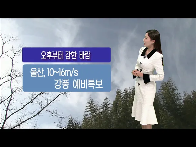 [하늘 맑아.. 오후부터 강풍 유의]1) 따뜻했던 연휴, 잘 보내셨나요? 다시 일상으로 돌아가는 월요일인 오늘 오전까지 구름만 많다가 오후에는 맑아지겠습니다. 오늘 기온도 포근합니다. 현재 기온 9도, 한낮 최고기온은 12도까지 오르겠습니다.2) 다만 오후부터 강한 바람이 예상됩니다. 울산에는 35~60km/h(10~16m/s)로 ...