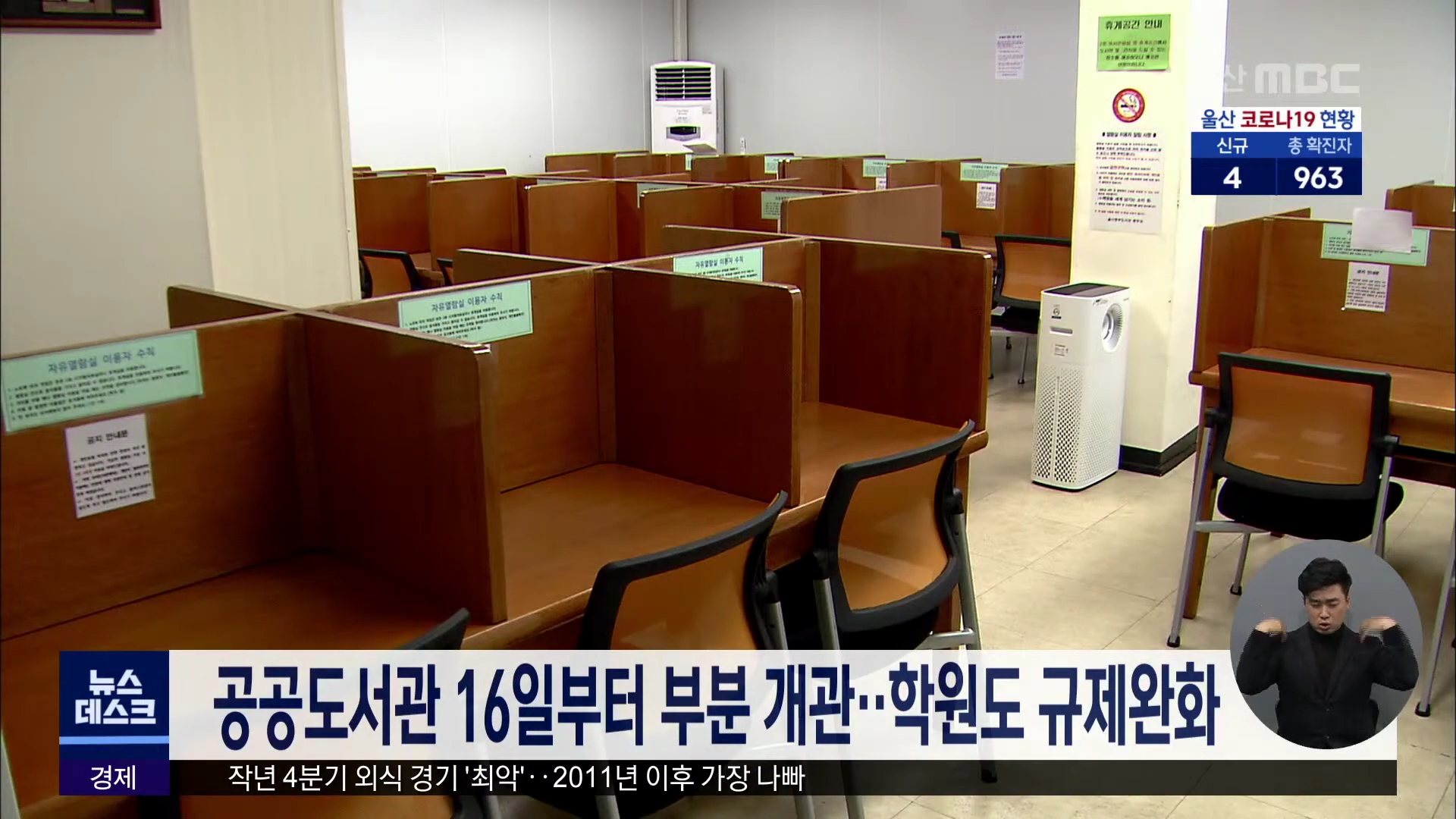 사회적 거리두기가 1.5단계로 완화됨에 따라 공공 시설이 부분적으로 운영됩니다. 울산시교육청은 내일(2/16)부터 산하 4개 공공도서관의 자유실과 자유열람실 이용인원을 50%로 제한해 운영하기로 했습니다. 학원은 영업시간 제한이 풀리는 대신 시설면적 4제곱미터당 1명을 수용하거나 한 칸씩 띄워앉기를 해야 합니다.//...