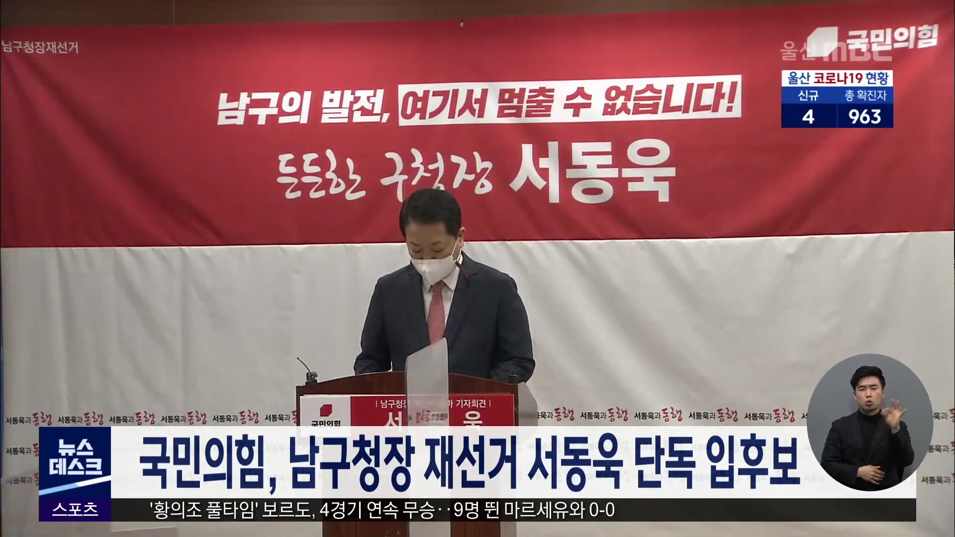 국민의힘의 남구청장 재선거 후보 공천에 서동욱 전 남구청장 한 명만 응모했습니다. 오늘(2/15) 국민의힘 울산시당이 마감한 공천 신청 결과 서동욱 전 남구청장 외에는 응모한 인사가 없어, 서동욱 전 청장이 사실상 최종 후보로 확정될 것으로 보입니다. 한편 국민의힘의 울주군 나선거구 보궐선거 공천에는 박기홍 범서...