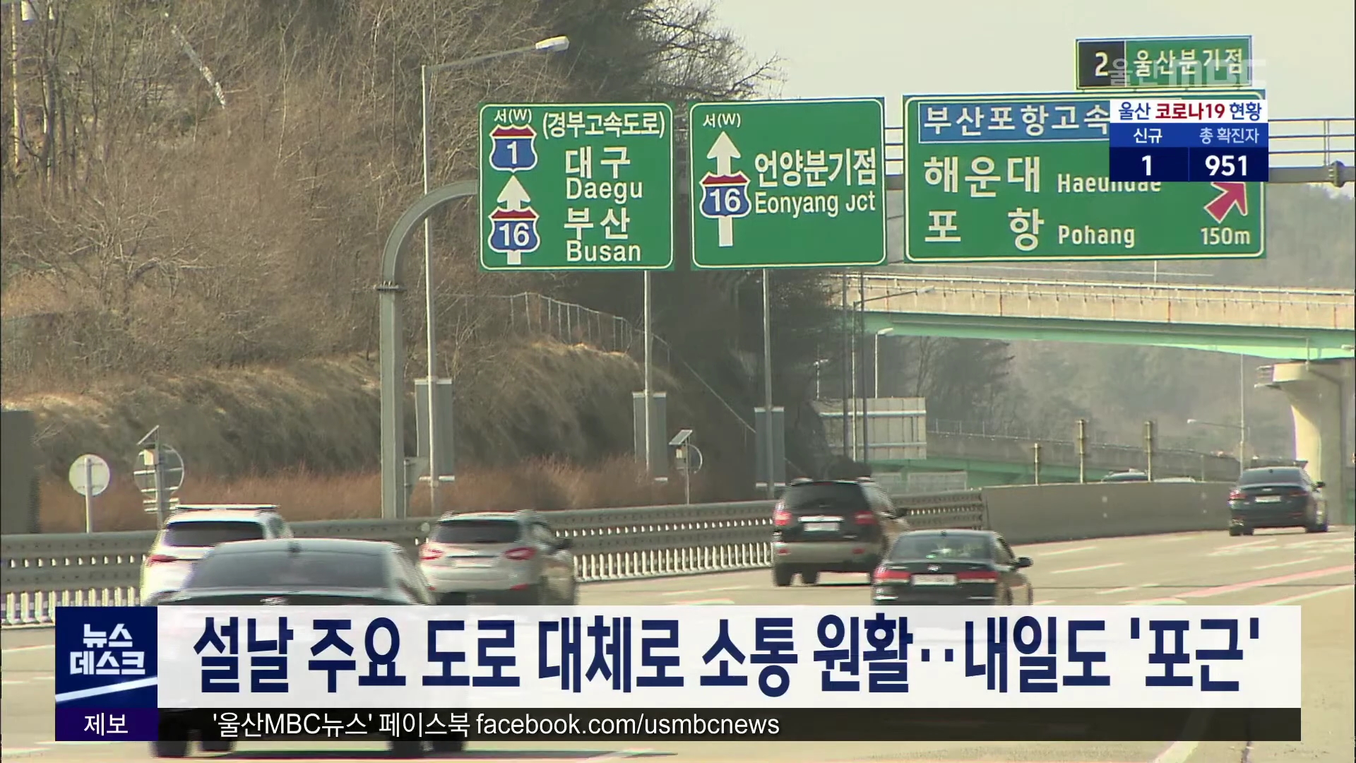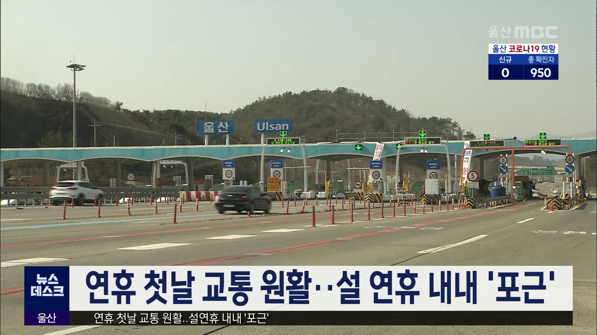 설 명절인 오늘(2/12) 울산지역 주요 도로는 대부분 원활한 교통 흐름을 보였습니다. 한국도로공사 울산시자는 설 당일인 오늘(2/12) 모두 4만 6천여 대의 차량이 울산을 오고 갔다고 밝혔습니다. 설 연휴 셋째날인 내일(2/13)은 아침최저 3도, 낮 최고 17도로 평년보다 높은 포근한 날씨가 이어지겠다고 울산기상대는 예보...