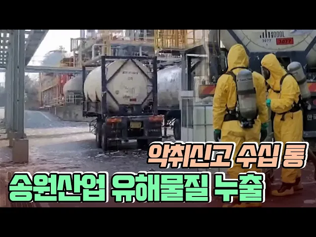 ◀ANC▶오늘(2/10)(어제) 오전 울산 남구 송원산업 매암공장에서유해화학물질이 누출되는 사고가 발생했습니다.다행히 인명피해는 없었지만가스 냄새와 비슷한 악취가 퍼지면서울산소방본부에도 주민의 신고가 잇따랐습니다.이용주 기자. ◀END▶ ◀VCR▶울산 남구에서 석유화학제품을 생산하는송원산업 매암공장.마스...