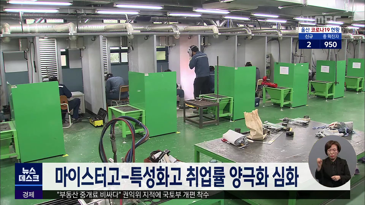 울산지역 직업계 고등학교의 취업률이 양극화되고 있습니다. 울산시교육청에 따르면 지난 8일 기준 3개 마이스터고의 취업률은 87.2%인데 반해 8개 특성화고의 취업률은 16.2%로 5배 이상 차이가 났습니다. 4년 전 취업률을 보면 마이스트고는 57.8%, 특성화고는 42.4%로 15% 정도밖에 차이가 나지 않았습니다.//