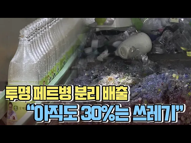 ◀ANC▶지난해 12월부터 투명 페트병을 전용 수거함에 분리해 버리는 게 의무화 됐습니다.이에 따라 페트병에 색깔을 빼거나아예 라벨이 없는 페트병으로제품을 생산하는 업체들도 생겼는데요.이렇게 제도가 시행된 지 한 달이 지났지만아직도 전체 재활용 페트병의 30%는쓰레기로 버려지고 있다고 합니다.이용주 기자가 ...