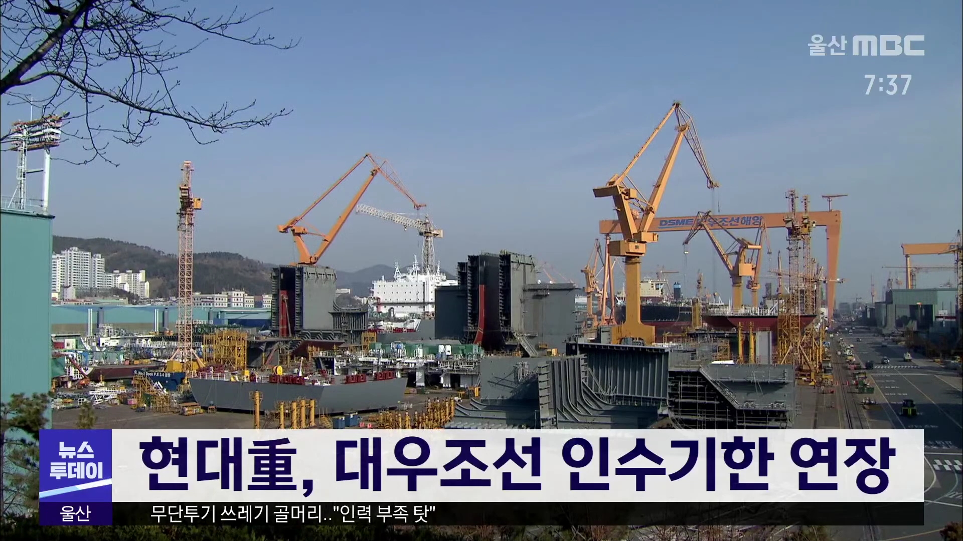 현대중공업그룹 지주사인 한국조선해양이 대우조선과의 인수 기한을 연장하는 수정계약을 산업은행과 체결했습니다. 한국조선해양은 유럽연합의 기업결합 심사 지연 등으로 인수합병이 늦어지자 투자계약 기한을 오는 6월 30일까지 연장하고 신주인수권 취득 기한도 올해 말까지 연장한다고 밝혔습니다. 한국조선해양은 카...