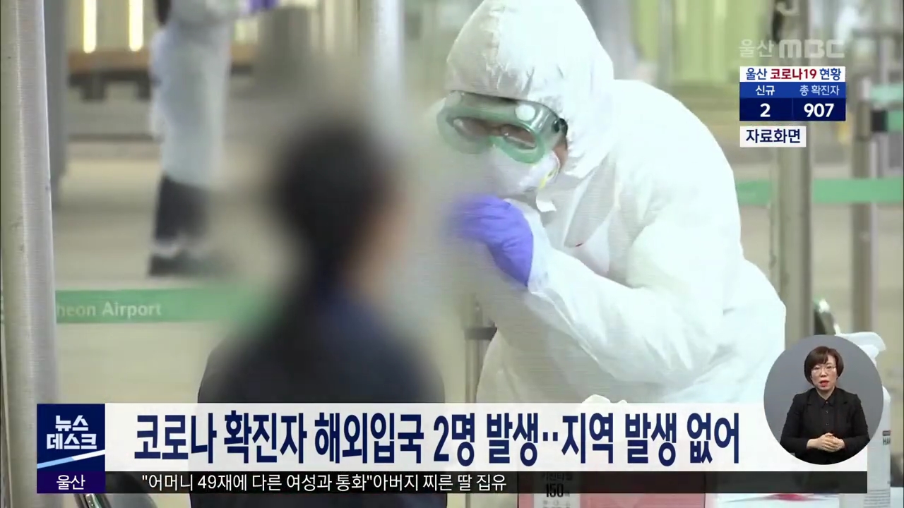 울산에서 해외입국 코로나 확진자 2명이 발생해 모두 907명이 됐습니다. 오늘(1/21) 확진을 받은 동구에 사는 30대와 중구에 사는 40대는 모두 해외입국 후 격리기간 검사에서 양성 판정을 받았습니다. 지역 발생 확진자가 한 명도 나오지 않은 것은 지난달 4일 이후 48일 만입니다.