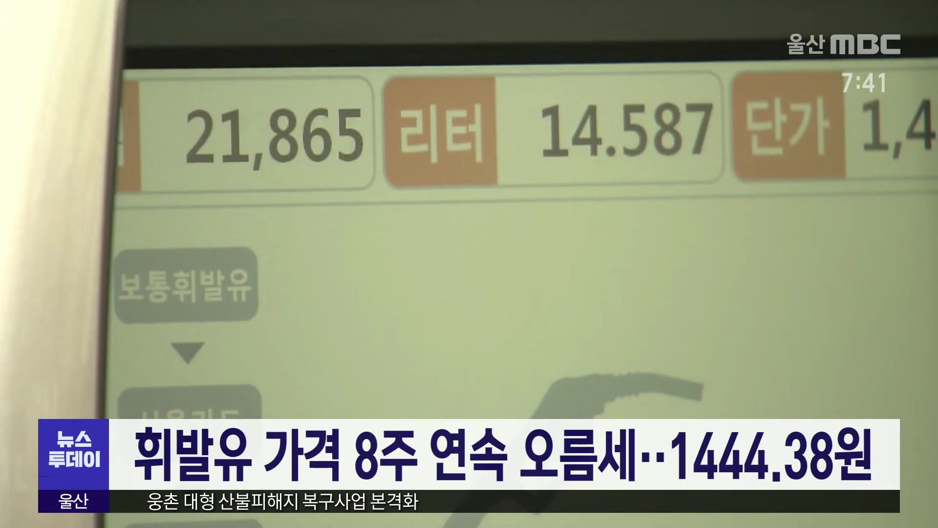 울산지역 주유소 휘발유 가격이 8주 연속 올랐습니다. 1월 둘째 주 울산 주유소 휘발유 평균 가격은 지난주보다 8원 오른 리터당 1천 444.38원으로 집계됐습니다. 한국석유공사는 세계 경제 회복에 대한 기대감으로 국제유가가 계속 오름세를 보이고 있는데다 사우디의 2∼3월 추가 감산 등의 영향으로 당분간 기름값이 오를...
