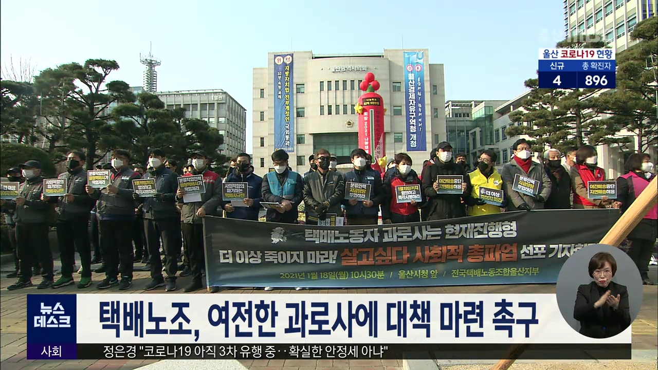 택배노조 울산지부가 오늘(1/18) 시청 앞에서 기자회견을 열고 정부의 택배노동자 과로사 대책 이후에도 여전히 과로사가 발생하고 있다며 대책마련을 촉구했습니다. 이들은 정부가 택배 분류작업 인력 투입 지원을 약속한 이후에도 많은 택배사에 사실상 인력투입이 되지 않고 있다고 주장했습니다. 택배노조는 전국 노조...
