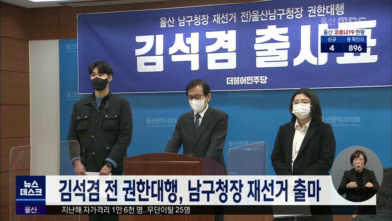 김석겸 전 울산 남구청장 권한대행이 오늘(1/18) 기자회견을 열고 남구청장 재선거에 더불어민주당 후보로 출마하겠다고 선언했습니다. 김 전 구청장 권한대행은 30년 공무원의 준비된 행정력으로 책임지는 봉사자가 되기 위해 도전장을 던진다는 포부를 밝혔습니다. 남구청장 재선거는 오는 4월 7일에 치러집니다.