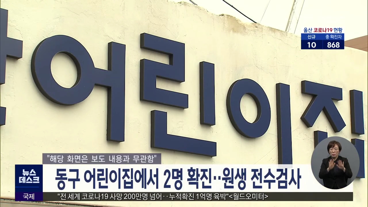 동구의 한 어린이집에서 직원 2명이 코로나19 확진 판정을 받아 방역 당국이 추가 감염 여부를 조사하고 있습니다. 오늘(1/15) 추가된 859번 환자는 이 어린이집의 운전기사로, 860번 환자는 조리사로 근무해 왔으며 이들의 감염 경로는 아직까지 확인되지 않고 있습니다. 울산시는 이 어린이집을 소독하고 교직원 13명과 ...