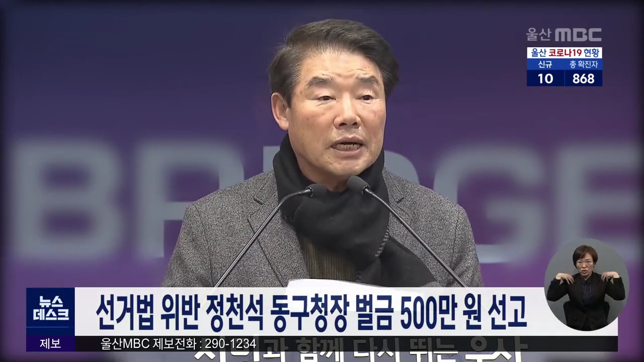 21대 총선을 앞두고 특정 후보 지지 발언을 한 혐의로 재판에 넘겨진 정천석 울산동구청장이 1심에서 직위를 상실할 수 있는 벌금 500만원을 선고받았습니다. 울산지법 형사12부 김관구 부장판사는 공직선거법 위반 혐의로 기소된 정 구청장에게 벌금 500만원을 선고했습니다. 정 구청장은 2019년 12월부터 지난해 1월 사이...