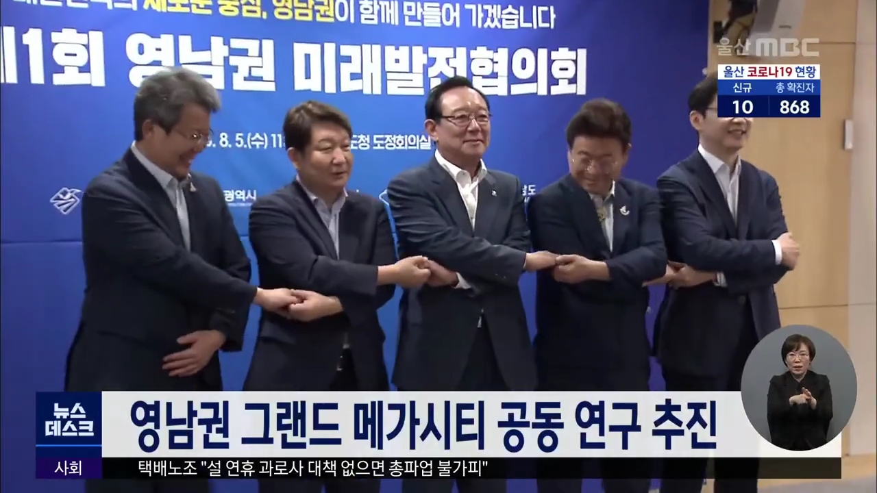 영남권 5개 시도를 수도권에 대응하는 '그랜드 메가시티'로 육성하기 위한 공동 연구가 추진됩니다. 8월까지 추진되는 이번 연구에는 울산과 부산, 대구·경북, 경남 등 4개 연구원이 참여합니다. 주요 연구 내용은 광역교통망 구축과 초광역 협력 프로젝트 사업 발굴, 영남권 광역 행정권 구축 방안 마련 등입니다. //