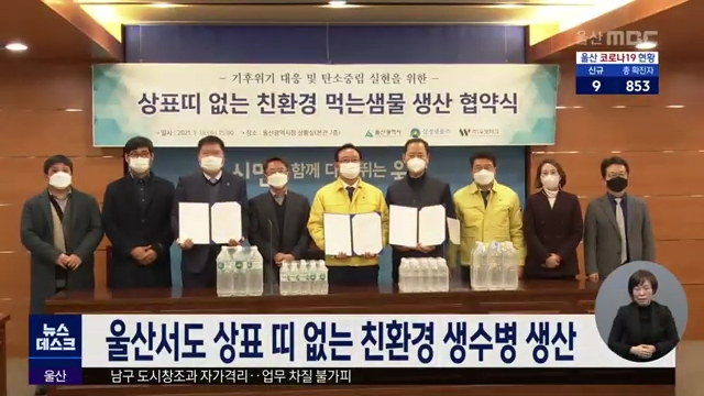 울산에서도 상표 띠 없는 친환경 생수병이 생산됩니다. 울산시는 오늘(1/13) 삼정생물과 우보테크와 오는 15일부터 상표 띠가 없는 친환경 생수병을 생산하기로 협약을 체결했습니다. 울산시는 이번 협약으로 플라스틱 연간 약 26t, 최종적으로 소각 처리 때 발생하는 온실가스 71t을 줄이는 효과를 거둘 것으로 예상하고 ...