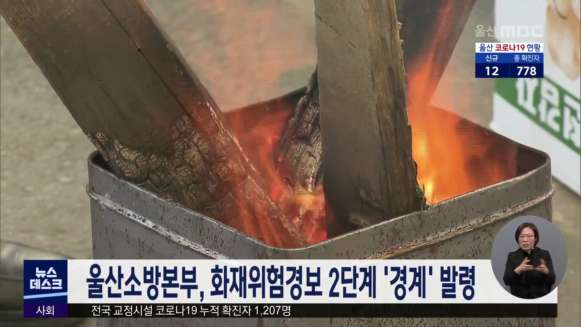 울산소방본부가 건조한 날씨와 갑작스런 추위로 화재위험성이 높아질 것으로 보고 울산 전역에 화재위험경보 2단계인 경계단계를 발령했습니다. 울산소방본부는 건조주의보와 함께 맹추위가 찾아와 전기와 가스 등 전열기구 사용량이 늘었다며 화재예방에 각별히 신경써줄 것을 당부했습니다.