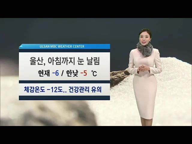 [울산, 아침까지 눈 날림.. 강풍주의보]1) 현재 시각, 우리 지역에 눈이 날리고 있는데요. 이 눈은 아침까지도 날리겠습니다. 오후부터는 맑은 하늘 나타나겠지만 한낮 최고기온 -5도로 기온 크게 오르지 못해 많이 춥겠습니다. 옷 따뜻하게 입으시기 바랍니다.2) 바람도 강해서 체감온도를 더 끌어내리고 있습니다. 울산에...