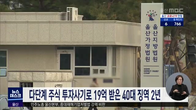 다단계 사기 방식으로 19억 8천만원 정도를 투자금으로 받은 40대에게 실형이 선고됐습니다. 울산지법 형사1단독 김정환 부장판사는 사기 등 혐의로 재판에 넘겨진 A씨에게 징역 2년을 선고했습니다. A씨는 2015년 11월 주식 사업에 투자하면 1∼2년 안에 원금을 돌려주고 매월 3%를 이자를 주겠다고 속여 47명으로부터 19억...