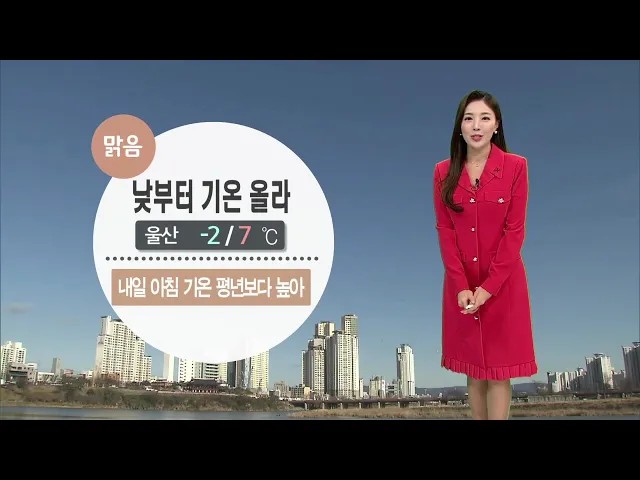 [한낮 최고 7도... 하늘 맑고 대기 건조해요]1) 2021년 새해 첫 월요일입니다. 새해 복 많이 받으시기 바랍니다. 오늘은 남해상에 위치한 고기압의 가장자리에 들면서 하늘 맑겠는데요. 현재 기온은 영하권이지만, 한낮 최고기온은 7도로 예상돼 낮 동안 크게 춥진 않겠습니다. 이렇게 낮부터 일시적으로 기온이 올라서 내...
