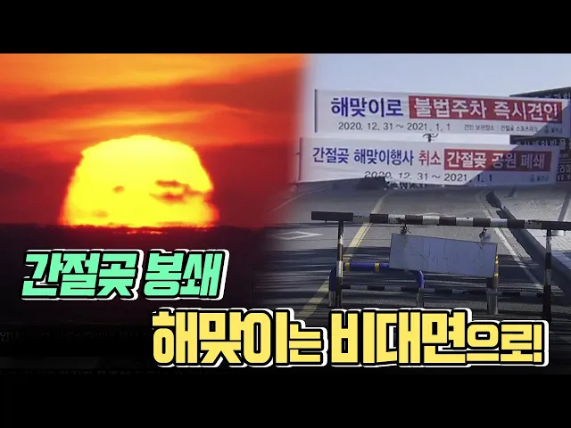 ◀ANC▶한반도 내륙에서 가장 해가 먼저 뜨는울산 간절곶은 봉쇄에 들어갔습니다.출입구와 주차장은 모두 폐쇄됐고 통제선을 넘어오는 해맞이객은행정조치하기로 했습니다올해만큼은 TV와 온라인으로 집에서 비대면 해맞이를 함께해주셔야 합니다.울산 정인곤 기자. ◀END▶ ◀VCR▶한반도 내륙에서 가장 먼저 해가 뜨...