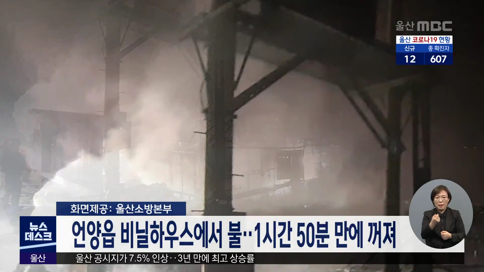 오늘(12/24) 새벽 1시쯤 울주군 언양읍의 한 비닐하우스에서 불이 나 비닐하우스 300제곱미터를 태워 소방서 추산 1천100만 원 정도의 재산피해를 내고 1시간 50분만에 꺼졌습니다. 소방당국은 전기적요인으로 불이 시작된 것으로 보고 정확한 화재원인을 조사하고 있습니다.