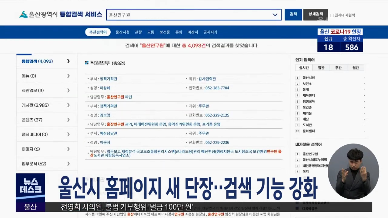 울산시 인터넷 홈페이지가 새롭게 단장돼 서비스에 들어갔습니다. 울산시는 시 홈페이지에서 17개 관련 기관의 정보를 한꺼번에 검색이 가능하도록 하는 등 이용자 편의를 위해 통합 검색 기능을 강화했다고 밝혔습니다. 시는 내일부터(12/23) 29일까지 이용자를 대상으로 개편된 홈페이지 만족도 설문조사를 실시합니다. /...