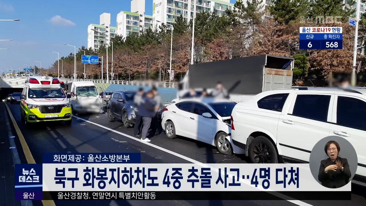 오늘(12/21) 오후 1시 44분쯤 북구 화봉지하차도에서 트럭과 승용차, SUV 2대 등 4중추돌 사고가 발생했습니다. 이 사고로 운전자 4명이 경상을 입고 병원으로 옮겨졌습니다. 경찰은 지하차도 직후 있는 신호등에서 대기하고 있는 차량을 보지 못하고 연쇄추돌이 일어난 것으로 보고 정확한 사고 경위를 조사하고 있습니다.