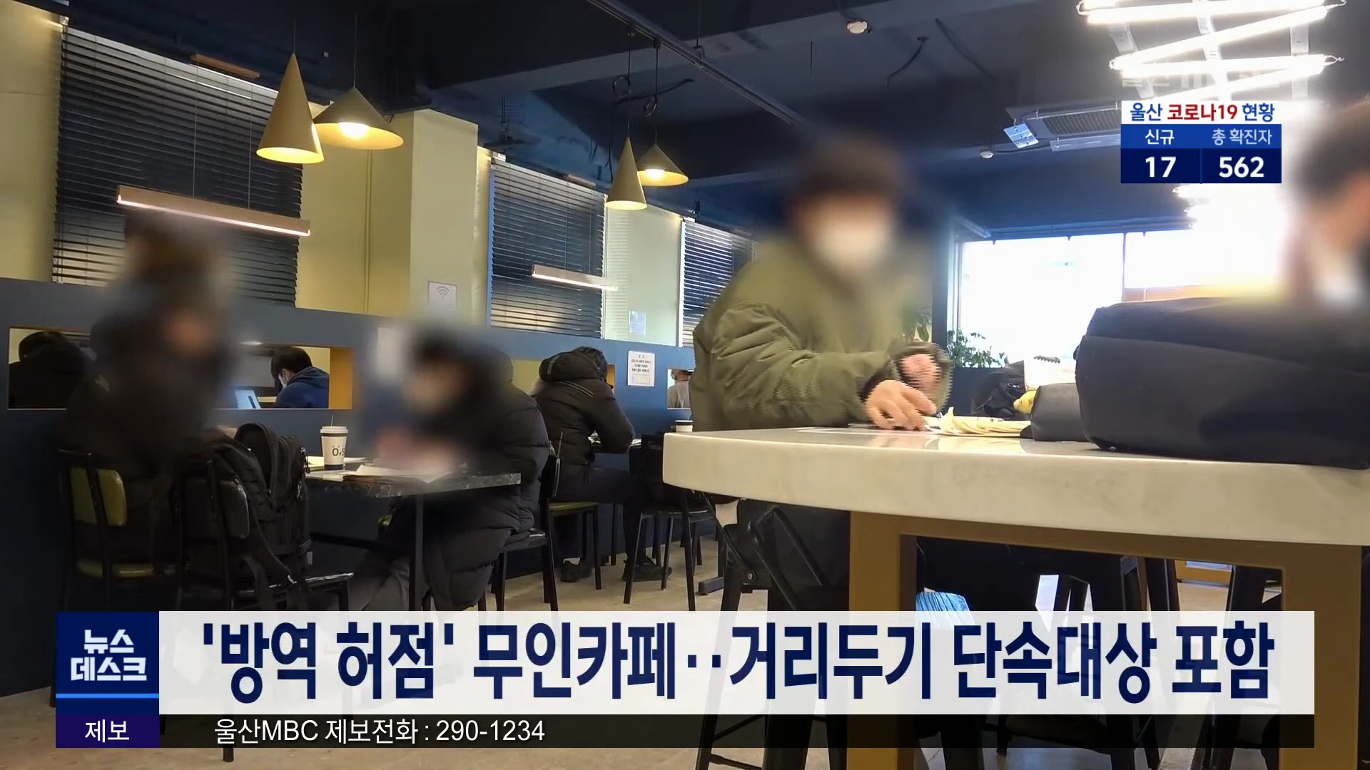 코로나19로 사회적 거리두기가 강화되는 가운데 무인카페가 단속의 사각지대에 방치되고 있다는 울산MBC 보도와 관련해 행정당국이 무인카페도 거리두기 단속대상에 포함시키기로 했습니다. 정부는 어제(12/17) 방역 사각지대로 지적된 무인카페에 대해 일반 카페와 같이 매장 내 착석과 취식을 금지하는 행정명령을 내렸습...