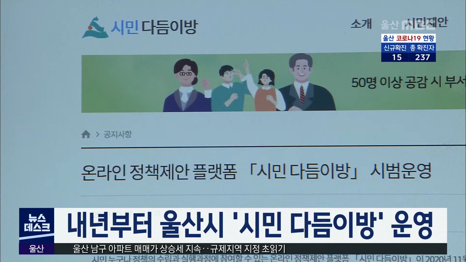 울산형 소통 홈페이지인 '시민 다듬이방'이 내년부터 본격 운영합니다. 울산시는 '시민 다듬이방'을 통해 지역 문제에 대한 시민들의 다양한 제안을 받아 시민 200명 이상이 공감을 보이면 토론을 거쳐 정책에 반영할 계획입니다. 또, '울산시가 묻습니다'라는 메뉴를 통해 울산시가 정책 수립 전·후 시민들의 생각을 청취...