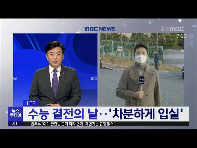 ◀ANC▶2021학년도 대입 수학능력 시험이잠시 후 울산지역 27개 시험장에서일제히 시작됩니다.수능 시험장에 취재진이 나가 있는데요, LTE로 연결해 보겠습니다.최지호 기자, 현장 분위기 어떻습니까. ◀END▶ ◀ 기자 LTE ▶네, 저는 중구 약사고등학교에 나와 있습니다.예년보다 3주 가량 늦게 치러지는 올해 수능은코로...