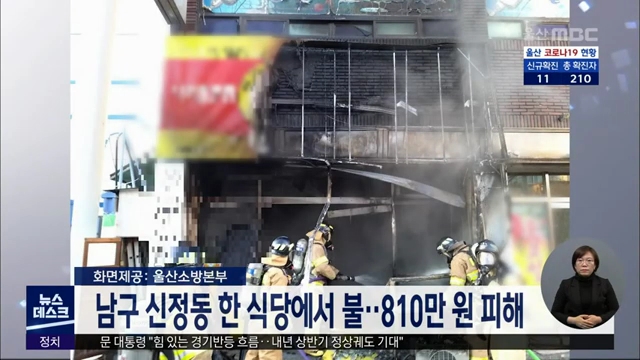 오늘(12/1) 오전 7시 35분쯤 남구 신정동의 한 식당에서 불이 나 건물 일부 등을 태워 소방서 추산 810만 원의 재산 피해를 내고 10분 만에 꺼졌습니다. 소방당국은 식당 주인 등을 상대로 화재 발생 경위를 조사하고 있습니다. //