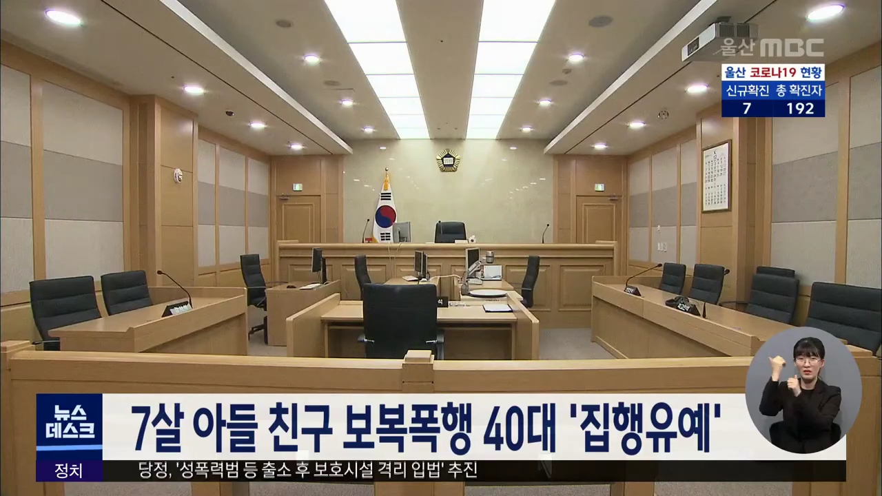 울산지법 형사10단독 김경록 판사는 7살 난 아들이 친구들에게 맞고 오자 아들의 친구를 찾아가 때린 혐의로 기소된 48살 A씨에게 징역 6개월에 집행유예 1년을 선고했습니다. A씨는 지난 7월 아들이 친구에게 맞았다며 울면서 집에 들어오자, 놀이터로 친구를 불러낸 뒤 휴대전화로 한차례 얼굴을 때리고, 아들에게도 친구...