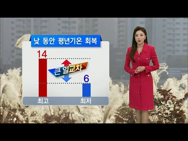 [어제와 기온 비슷.. 대기 점차 건조]1) 오늘 아침 공기는 어제와 비슷하게 출발합니다. 오늘은 고기압의 영향으로 하늘도 맑고 낮 기온도 14도로 평년 수준을 회복하겠는데요. 낮 동안에는 비교적 온화하더라도 일교차가 8도가량 벌어집니다. 출근길에는 따뜻하게 입어주셔야겠습니다.2) 연일 맑은 날이 이어지고 있죠. 때...
