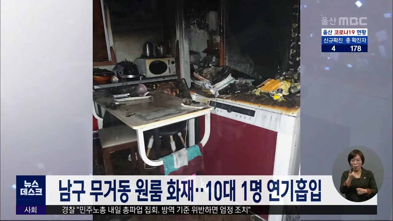 오늘(11/24) 새벽 3시 50분쯤 울산 남구 무거동의 한 원룸 3층에서 불이 나 김치냉장고 등 집안 일부를 태워 소방서 추산 500만원 상당의 재산피해를 내고 10여 분만에 꺼졌습니다. 이 불로 10대 거주자 1명이 연기를 마셔 병원으로 옮겨졌습니다. 소방당국은 목격자 등을 상대로 정확한 화재 원인을 조사하고 있습니다.//