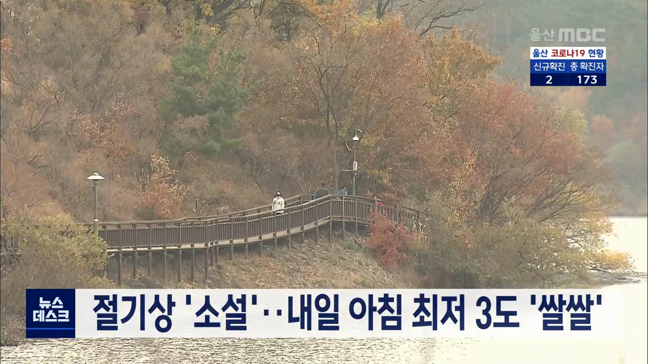 절기상 소설인 오늘(11/22) 울산지방은 구름 많은 가운데 낮 최고 기온이 어제와 비슷한 12도를 기록해 쌀쌀했습니다. 내일은 맑은 날씨 속에 아침 최저 기온이 3도까지 떨어져 춥겠으며, 낮 최고 기온도 13도에 머물겠습니다. 울산기상대는 당분간 아침 최저 기온이 5도 이하에 머물겠다며 건강관리에 주의를 당부했습니다...