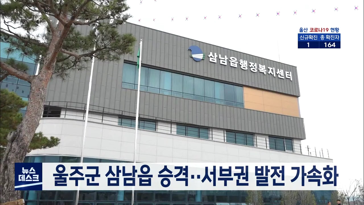 울주군 삼남읍 승격을 기념하는 개청식이 오늘(11/1) 삼남읍 행정복지센터에서 열렸습니다. 삼남읍은 KTX 역세권 아파트 입주 등으로 읍 설치 기준 요건인 인구 2만 명을 넘어 최근 행정안전부로부터 승인을 받아 울주군 6번째 읍으로 승격이 확정됐습니다. 울산시는 읍 승격으로 인해 KTX 울산역을 중심으로 울산 서부권 ...