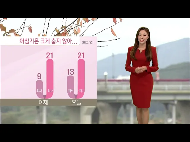 [어제와 비슷한 날씨... 밤에 미세먼지 일시적 나쁨]1) 출근시간대인 현재, 기온은 13도로 어제보다 4도가량 높아서 크게 춥진 않은데요. 오늘 고기압의 영향으로 하늘 맑겠고, 낮 동안 가을볕이 더해져 기온은 21도까지 오르겠습니다. 어제와 비슷한 옷차림 해주시는 게 좋겠습니다.2) 오늘 미세먼지를 조심하셔야겠습니다...