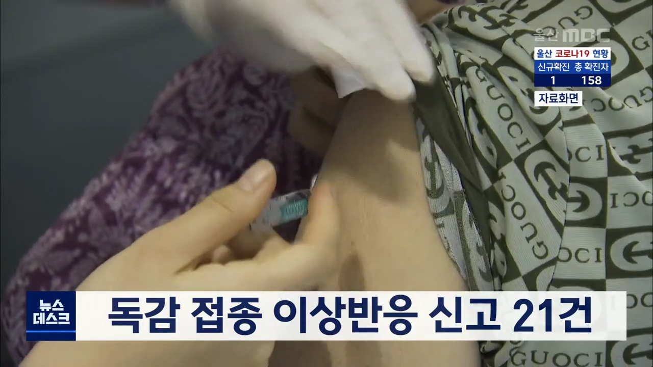 울산에서 독감 백신 접종 이후 이상 반응이 나타난다고 신고된 건수는 오늘까지 21건으로 집계됐습니다. 울산시는 증상 대부분이 피부가 붉어지는 발진, 발열 등 접종 후 일시적으로 나타나는 증상으로 다른 지역처럼 숨진 사람은 없다고 밝혔습니다. 울산시는 백신 접종과 사망사고 사이에 직접적인 인과관계는 없다며 무...