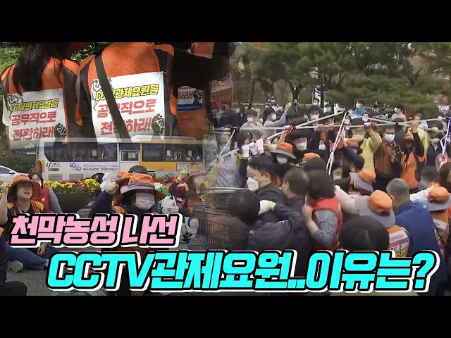 ◀ANC▶울산 5개 구·군 CCTV관제센터 요원들이정규직 전환을 촉구하며 4일(5일)째동구청 앞에서 농성을 벌이고 있습니다.동구청은 불법 점거로 규정하고천막을 강제 철거하는행정대집행을 실시하며 맞서고 있습니다.이들이 농성을 벌이는 이유가 무엇인지,이용주 기자가 취재했습니다. ◀END▶ ◀VCR▶목장갑에 마스크...