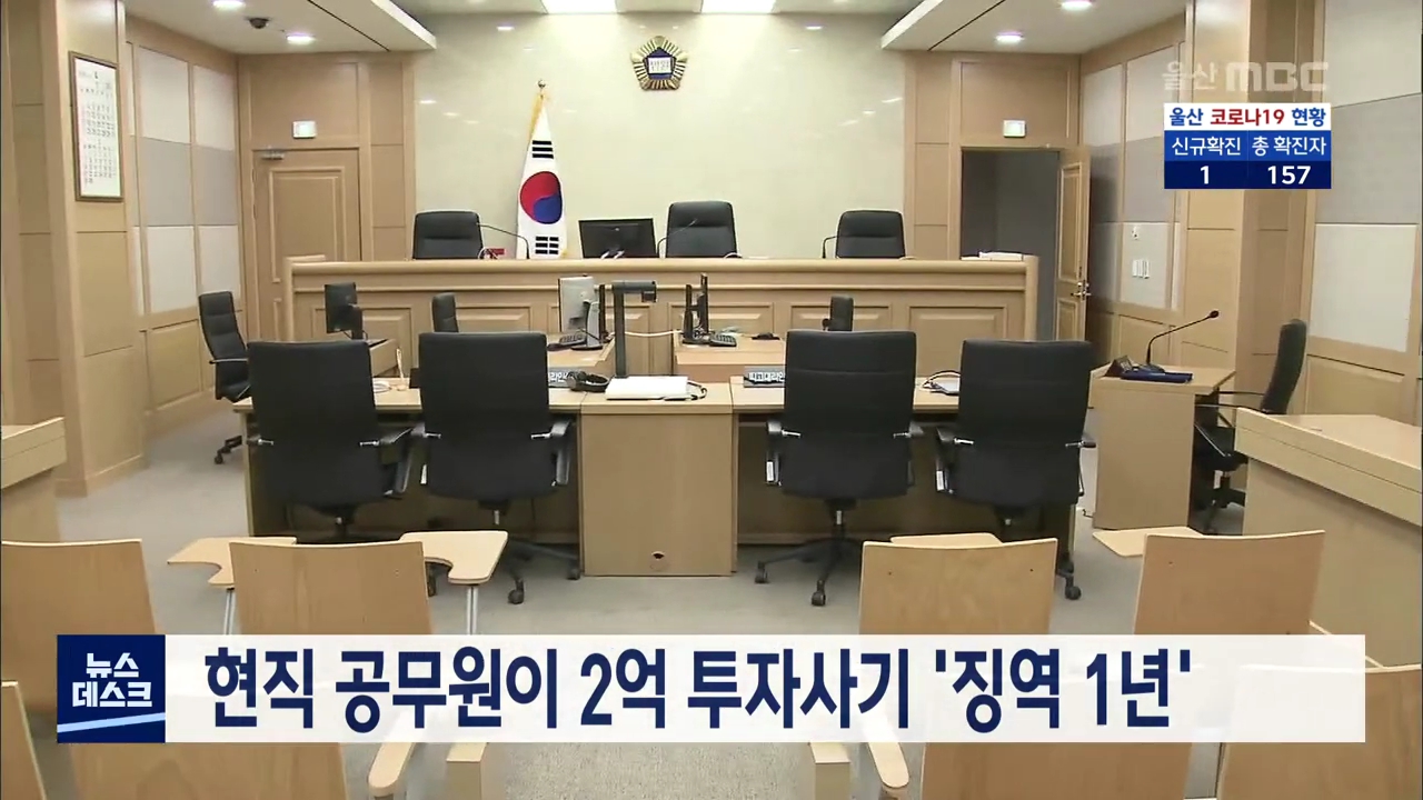 울산지법 형사2단독 유정우 판사는 워터파크 사업에 투자하면 고수익을 올리 수 있다며 2억 원을 가로챈 혐의로 기소된 법원 직원 52살 A씨에게 징역 1년을 선고했습니다. A씨는 지난 2017년 울산지방법원 내 회의실에서 경남지역 워터파크 인수 사업에 2억을 투자하면 50일 뒤 3억이 나온다며, 한 투자자에게 2억 원을 받...