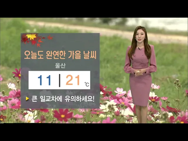[완연한 가을 날씨... 큰 일교차 유의]1) 중부지방의 단풍은 절정을 향하고 있고, 남부 지방 곳곳에서도 단풍이 물들어가면서 가을빛이 짙어지고 있습니다. 한 주의 시작인 월요일인 오늘 울산의 하늘 구름만 지나는 가운데 완연한 가을 날씨가 이어지겠습니다. 가을답게 일교차는 계속해서 10도 이상으로 크게 벌어지니까...
