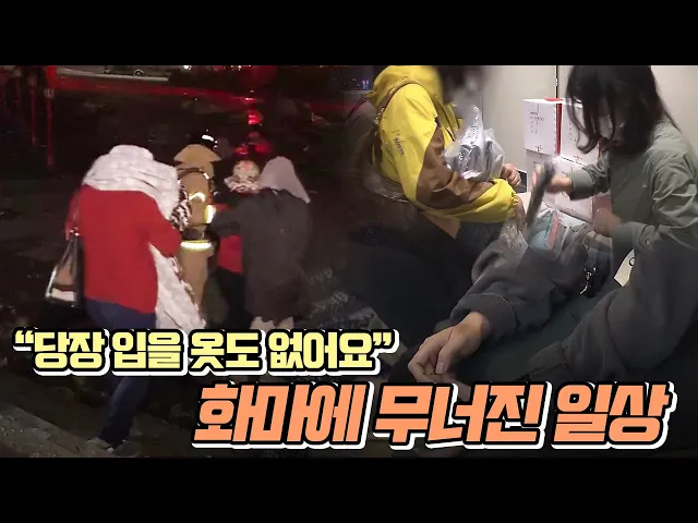 ◀ANC▶불길을 피해 대피한 사람들은 모두170여 명입니다.황급하게 나오느라 아무 것도 챙기지 못하고맨 몸으로 나온 사람들이 많은데당장 입을 것도, 먹을 것도 부족한 상황입니다.김문희 기자가 이들을 만났습니다. ◀END▶ ◀VCR▶일렬로 선 사람들이상자 안에든 수건과 옷을 차례로 꺼냅니다.재해구호협회에서 제공...
