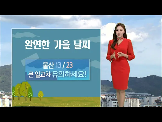 [완연한 가을 날씨... 일교차 주의]1) 높고 푸른 하늘에 선선한 바람이 불면서 완연한 가을 날씨가 이어지고 있습니다. 고기압의 영향으로 오늘도 맑은 날씨가 예상되는데요. 단 일교차에는 주의를 하셔야겠습니다. 울산의 현재 기온 13도, 한낮 최고기온은 23도로 일교차가 10도가량 크게 벌어지겠습니다. 나오실 때 옷차...