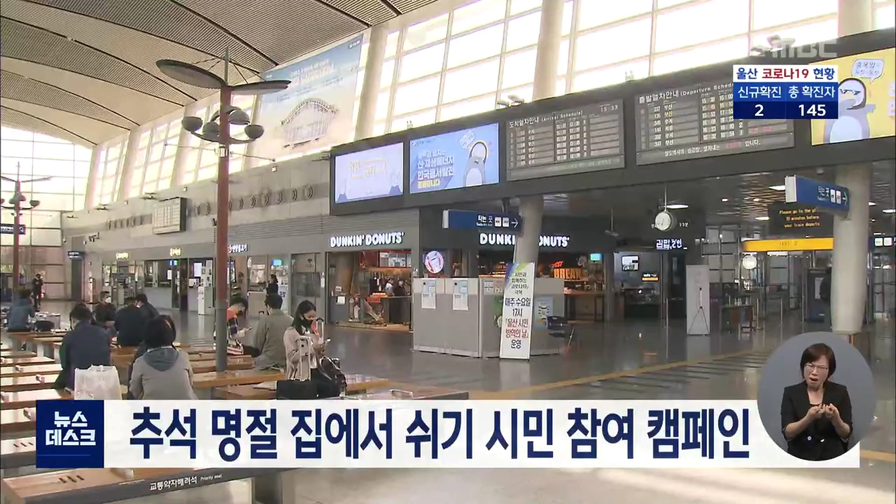 울산시는 다음달 4일까지 '추석 명절 집에서 쉬기’ 시민 참여 캠페인을 진행합니다.울산시는 전국민 대이동이 이뤄지는 추석 명절이 가을철 방역 관리의 분수령으로 판단하고이번 캠페인을 마련했다고 설명했습니다.울산시는 부득이하게 고향을 방문하는 경우를 대비해 추석 생활방역 수칙을 제작해 KTX울산역과 버스 터미...