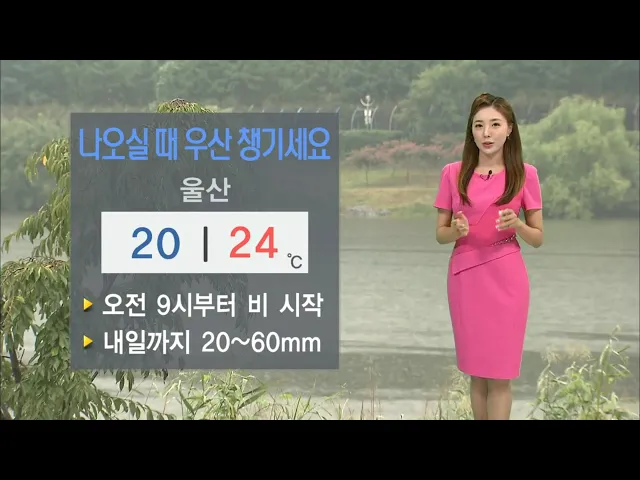 [오전부터 20~60mm의 비... 한낮 24도로 '선선']1) 오늘은 비 소식이 있어서 우산을 챙기셔야겠습니다. 오전 9시경 울산과 부산부터 비가 시작돼 오후에는 경남 남해안으로 확대되겠습니다. 비는 내렸다 그쳤다 반복하겠고, 내일까지 울산에는 20~60mm 가량의 비가 내리겠습니다.2) 오늘은 바람도 주의하셔야겠습니다. 오늘...