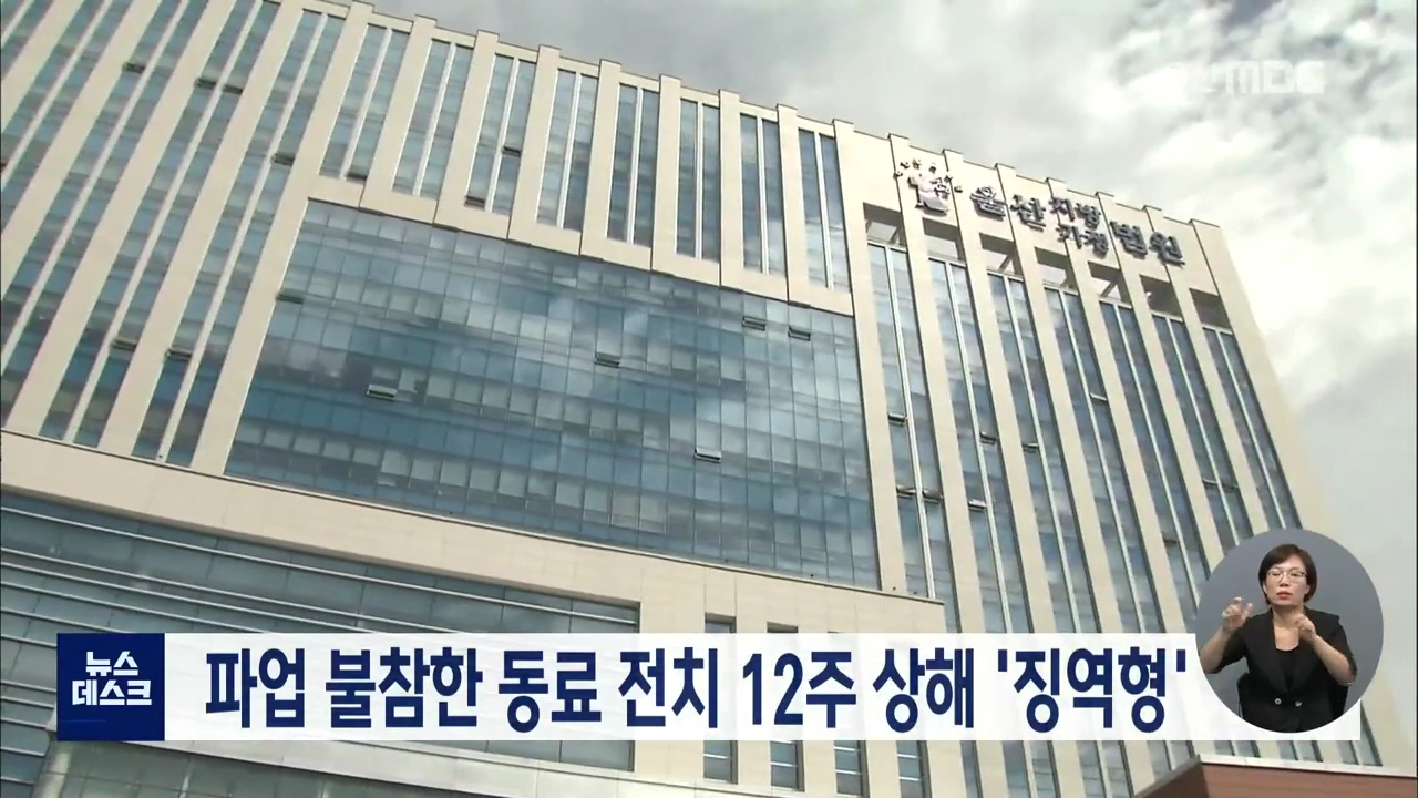 울산지법 형사5단독 이상엽 판사는 파업에 동참하지 않은 조합원에게 전치 12주의 상해를 가한 혐의로 기소된 35살 A씨에게 징역 10개월을 선고했습니다. 현대중공업 근로자인 A씨는 지난해 6월 파업에 참여하지 않는 조합원을 발견하고 다툼을 벌이다 허벅지를 잡고 넘어뜨려 골절 등의 중상을 입힌 혐의로 기소됐습니다. ...