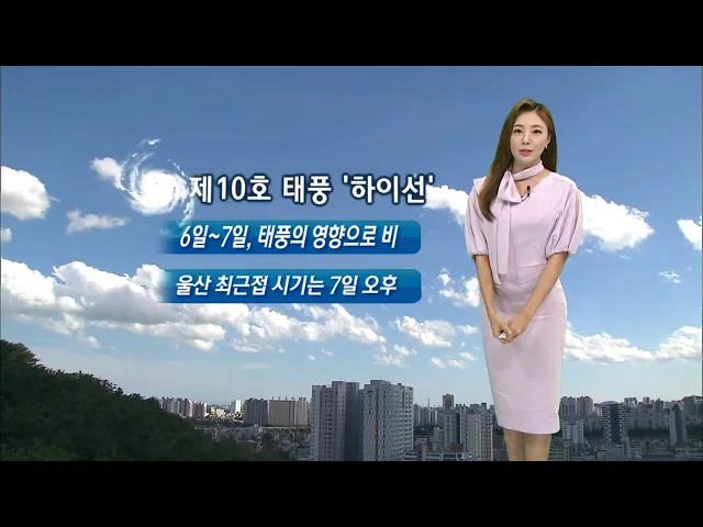 [맑고 더워요... 6일~7일, 태풍 '하이선' 영향으로 비]1) 태풍이 물러가고, 오늘은 맑은 날씨에 강한 햇볕까지 내리쬐겠습니다. 울산의 현재 기온 20도, 한낮 최고기온 30도로 예상되는데요, 당분간 아침 기온은 20도 안팎으로 선선하겠습니다.2) 한편, 뒤따라오는 제10호 태풍 '하이선'이 북상중입니다. 우리나라는 모레인...