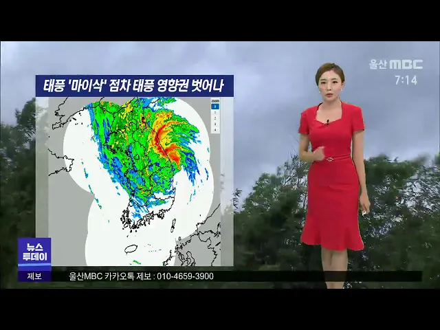[태풍 영향권 차차 벗어나... 오후까지 강한 바람]1) 태풍 마이삭은 새벽 사이 울산지역에 큰 비바람을 몰고 지나갔습니다. 현재 태풍은 경상도를 따라 빠르게 북상해 오늘 아침 9시면 동해상으로 이동하겠고, 점차 태풍의 영향권에서 벗어나겠는데요. 2) 그래도 오후까지는 강한 바람이 지속돼서 계속해서 주의하셔야겠습...
